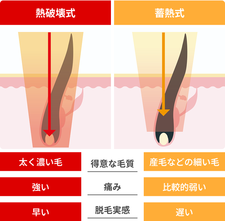 脱毛器の種類を選べるクリニックなら、自分の毛質や痛みの感じ方に合わせた施術が可能。濃い毛に強い「熱破壊式」、産毛に対応し痛みが少ない「蓄熱式」など、最適な方法を選べるのがメリットです